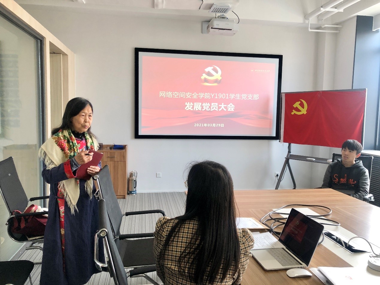 2021年3月29日下午13时30分,北航网络空间安全学院Y1901学生党支部在一号馆408会议室召开支部党员发展大会,讨论能否接收李彤、敦明、温永晴、夏羽4名同志为中共预备党员。本次大会由党支部书记徐子钧主持,党建特邀组织员邓彦敏老师、专职组织员王倩云老师、专职辅导员杜逸雯老师列席本次会议。支部党员应到12人,实到10人,江廷宇和辜智强2名党员同志因校外实习请假,二人已提前向党组织提交表决是否接收预备党员的书面意见。