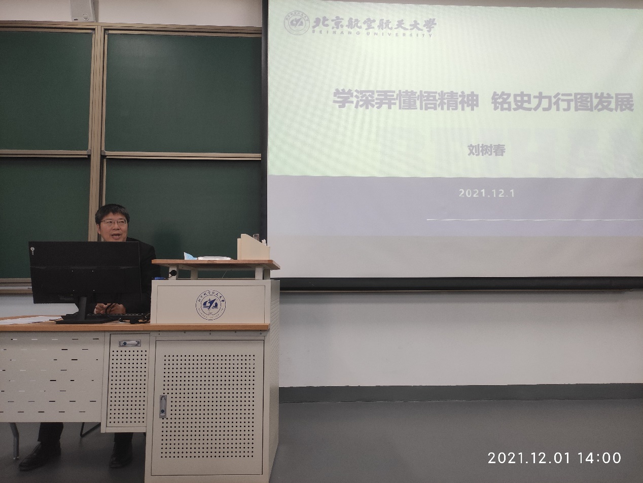 随后,刘树春校长结合党史,重温北航光辉校史,介绍了北航“为国而生、与国同行”,建校以来,一代代北航人传承“空天报国”精神,为国家作出了突出贡献,优秀校友包括学术精英、兴业人才和治国栋梁,充分展现出“家国情怀、正直真诚、创新担当、实干有为”的精神特质。